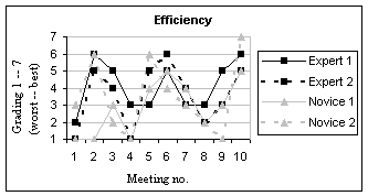 By calculating the trend for the efficiency of the meetings, it was seen that the efficiency increases during the ten meetings that shows that the study was not long enough to be called long-term, as efficiency was still increasing when the study was terminated. Nevertheless the results show how people (primarily the novices) learned to use the system and get used to it in such a way that the group could become a regular user group for AW. The adaptation process observed in this study is not only to the technology, but also a social adaptation between the users.