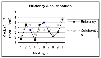 By calculating the mean values for collaboration and for efficiency there can be observed a covariation between these values for the different meetings, see Figure 3. The efficiency varies with the character of the meetings too.