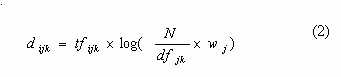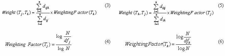 The co-occurrence weight, dijk , is the weight between term j and term k that are both exist in document i . tfijk is the minimum between occurrence frequency of term j and that of term k in document i . The weight will be zero if neither term j or term k exists in the document.