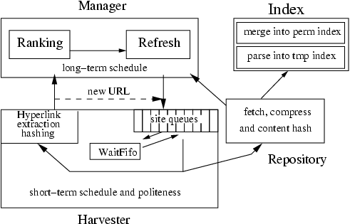 The high-level architecture of a search engine is described in various surveys [2, 4, 13]. Since we only crawl among a few tens of millions of pages, our engine also contains a mixture of a news agent and a focused crawler. Similar to the extended crawl model of [5], we include long-term and short-term crawl managers. The manager determines the long-term schedule refresh policy based on PageRank [2] information. Our harvester (modified Larbin 2.6.2 [1]) provides short-term schedule and also serves as a seeder by identifying new URLs. Eventually all new URLs are visited or banned by site-specific rules. We apply a two-level indexer (BerkeleyDB 3.3.11 [12]) based on [11] that updates a temporary index in frequent batches; temporary index items are merged into permanent index at off-the-peak times and at certain intervals the entire index is recompiled.