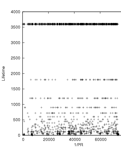 Figure 3: Scatterplot of PageRank and average lifetime (in minutes) of 3 million pages of the .hu domain. In order to amplify low rank pages we show 1/Pagerank on the horizontal axis.