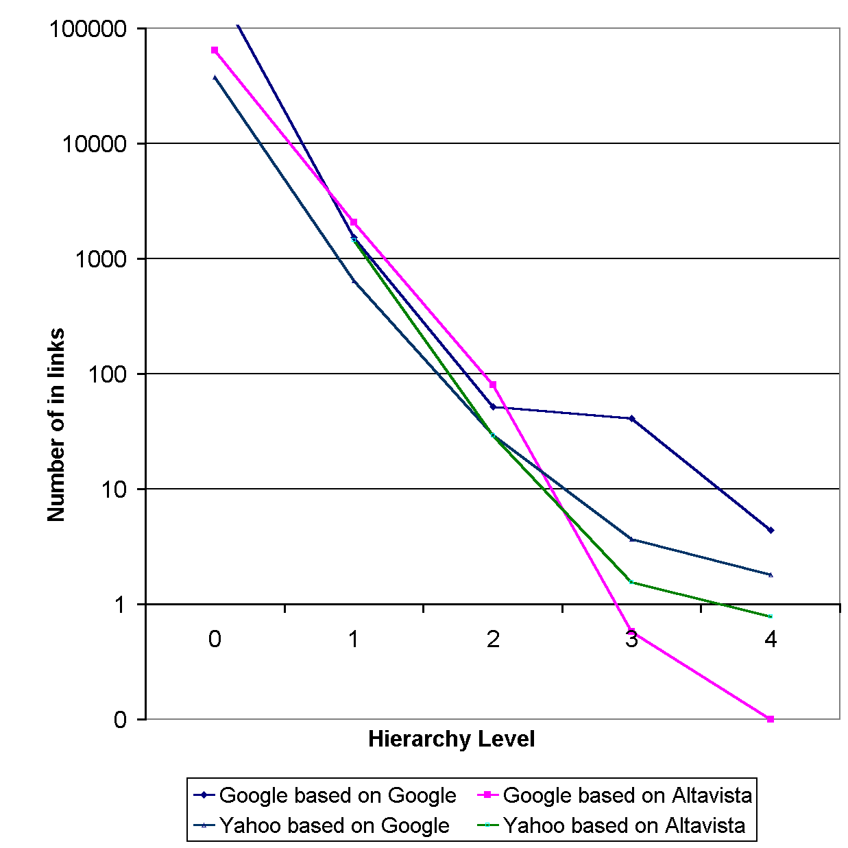 The first experiment analyzed the relationship between the number of back links to a catalogue page and the hierarchy level of that page. The information derived during the web mining process, shows a drastic decrease in the number of links for a decreasing hierarchy level. The lower the catalogue pages are positioned in the topical hierarchy, the less likely they are to receive back links. These findings show that humans are much more likely to set a link to a page which is positioned at a higher level of the hierarchy of a web site. The relation is visualized in figure 1.