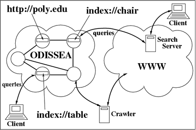 Figure 1: ODISSEA as a web search infrastructure, with a web crawler as update client, and a client-based and a web service-based search client.