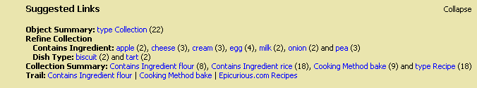 Using this navigation framework, Haystack is able to provide a navigation interface for any information provided in RDF[2], the W3C standard for representing semistructured data as triples. As an example of the navigation system, metadata was extracted from the recipes website Epicurious.com, in such a way that a recipe’s ingredients are expressed as properties of the recipe, where the property name would be “ingredient” and the property values would be “rice”, “egg”, etc.