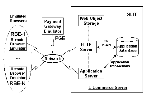 The TPC-W e-commerce benchmark [1, 2] has client-server architecture. Figure 1 shows the elements which make up the architecture of the benchmark. The SUT (System Under Test) includes all the components that constitute a typical e-commerce server. The RBEs (Remote Browser Emulators) emulate the workload that real customers would generate. The PGE (Payment Gateway Emulator) emulates the entity which authenticates the users and authorizes the payments. The SUT, the PGE and the RBEs communicate through a dedicated network.