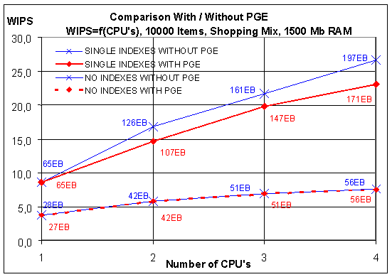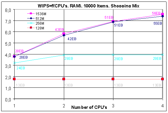 When the minimum amount of memory which allows the database to operate is installed (curve of 128 MB), the number of processors used has no influence on WIPS. In other words, under the maximum memory contention conditions, the scalability of the e-commerce server is null.