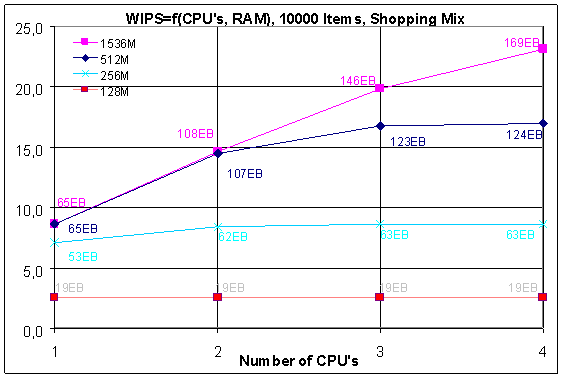 To evaluate the influence of hardware system factors on WIPS, a set of experiments with the number of processors varying between 1 and 4 and the memory installed varying between 128 MB and 1,5 GB was carried out. Figure 2 shows the results of the experiments.