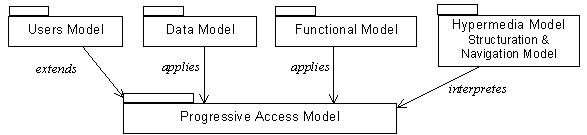 These four models have been defined in order to integrate the principles of the progressive access into each of the dimensions (content, functionalities, hypermedia features) of a WIS and, moreover, considering adaptation to user. To reach this goal, we widely exploit the possibilities offered by the PAM, the reference model in our approach. Figure 2 shows the relations that hold between this model and the four other ones.