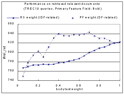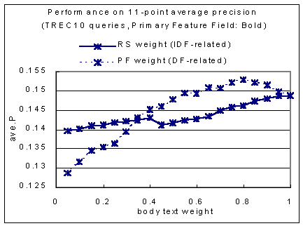 Figure 1 and Figure 2 show the average performance of using bold character as Primary Feature Field on TREC10 fifty test topics, in terms of the number of relevant documents returned (describing the recall of the system in top 100 documents) and 11-point average precision, respectively. In figure1, with proper body text impact weight (λ in Eq.7), our PF weighting schema returns much more relevant documents in top 100 results than the traditional RS weighting does. When λ is not less than 0.3, the recall of PF weighting is higher than the best result got by RS weighting.