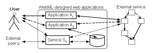 This section explains the components present in the WebML architecture before the present work, shown in Figure 2 in regular lines and fonts.A WebML site definition consists of a data schema structured in Entities and Relationships, and a hypertext describing the content of the site in terms of the underlying data model. In the hypertext model, web pages are defined as sets of interconnected units. A unit is an elementary piece of content corresponding to a parameterised query over the underlying E-R data model. Units, pages and their correlations are specified using WebML's library of graphical primitives.