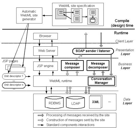 WebML runtime extensions. These extensions are depicted in bold lines and fonts in Figure 2. We extend the runtime to support exchanging web service messages: we add a SOAP sender/listener, and a Conversation Manager for conducting long-running interactions with a service. Finally, we extend the site generation algorithm to produce descriptors for each of the new primitives, which will be used in the generated JSP pages.