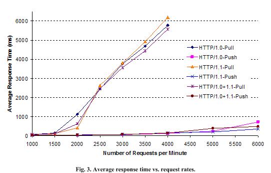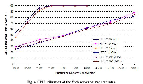 In Fig. 4, all the unicast-pull cases again incur a very large CPU utilization on the server. Although the HTTP/1.1-Pull case incurs the least among the three, they all reach 100% CPU utilization when the request rate reaches 2,500 per minute. The main reason contributing to such high CPU utilizations is due to the fact that the Web server is required to keep a large number of socket connections. There is a protocol control block (PCB) table in the Web server OS that keeps the network connection states. A large PCB table not only consumes more kernel memory, but also consumes more CPU cycles. When the MOLD mechanism is used, the CPU utilizations on Web server do not rise higher than 90% in all the tests, because the server no longer keeps a large number of TCP connections.