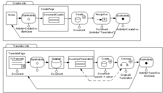 Example. Figure 3 presents a WFdHT implementing a simple process consisting of two activities performed by two different users: the creation of a document and its translation. Two hypertexts (Creator and Translator sites) represent the operations required for performing the two activities. In the first hypertext the first kind of user starts the process and the creation activity by following a link exiting the home page: the activity consists in filling a form; when submitted, a new document is created and assigned to the translation activity (by means of the assign operation). The activity is ended and the user is led back to the home page. In the second hypertext the translator first selects a document to be translated from an index showing the documents assigned to the translation activity (through a workflow-aware index unit), then the translation activity starts for the selected document. The user fills in a form with the translation, and a new document is created and associated with the original one. This activity ends the whole process.