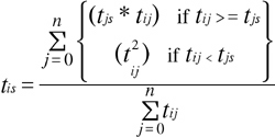 For any node that has a direct edge to the sink, we ignore paths and use the weight of that edge as the trust rating. For any node that is not directly connected to the sink, the trust rating is determined by a weighted average of the values for each of its neighbors. This function recourses for each neighbor until it grounds out in direct connections. More formally, the calculated trust t from node i to node s is given by the following function: