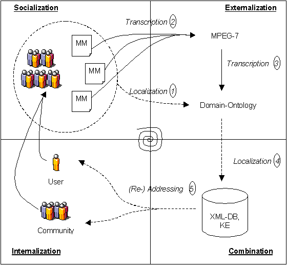 The MPEG-7 standard [4], introduced by the moving pictures expert group (MPEG), specifies a set of descriptors and description schemes that permit the transcription of versatile multimedia information for a variety of web applications. The XML-based MPEG-7 standard allows (loose) categorization of new content from different sources and types. In contrast to strict classification of data in ontology-based systems, the idea of multimedia concepts is the more or less unclassified handling of information. Therefore, the metadata used for semantic enrichment of multimedia concepts is based on the fact that knowledge transfer has to be analyzed with respected to the medium. Based on a total view on all multimedia (MM) files to be covered a localized (1) ontology-like MPEG-7 schema is being developed (cf. figure 1). In contrast to structures of ontology-based systems the underlying ontology is being interpreted (transcribed (2)) with the graph description tools compatible to MPEG-7. Transcription (3) of MM files can be done straight forward in the range of MPEG-7 free text annotation tags. That allows us to combine the advantages of a loose categorization with the concepts of metadata annotations, as it is needed for the tight interplay between the organization of knowledge and communicative processes within the CoP. Thereafter, all information is stored localized (4) for the CoP in a XML database with respect to the domain ontology which can be conceptualized as the shared vocabulary of the CoP. It is accessible to all users in final (re-) addressing (5) processes for the CoP as a shared learning history or as identity building learning process [6].