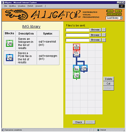 Once a program has been built, on the client computer, and checked for errors (all activities carried out through JavaScript), it is properly coded and sent to the Alligator server (the same from which the initial pages were downloaded). Here it is processed block by block, invoking, when necessary, distributed execution of some parts on remote computers and managing the relative flow of data. Typically, programs implemented within the Alligator environment include output blocks which, when executed, add their data to a "result page". When program execution is finished, the server returns to the user such page (in a new window).