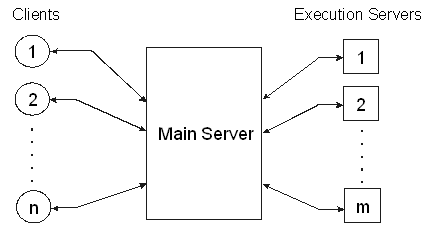 Alligator is a client-server application composed of three kinds of machines: the main server, execution servers and clients. Clients are the user machines, i.e. those on which visual programming is carried out through a Web browser. The main server takes care of managing requests from clients and invoking processings on execution servers, where the actual execution of some blocks occurs. Execution servers take also care of returning their results to the main server. The architecture just proposed is schematically represented in Figure 2.