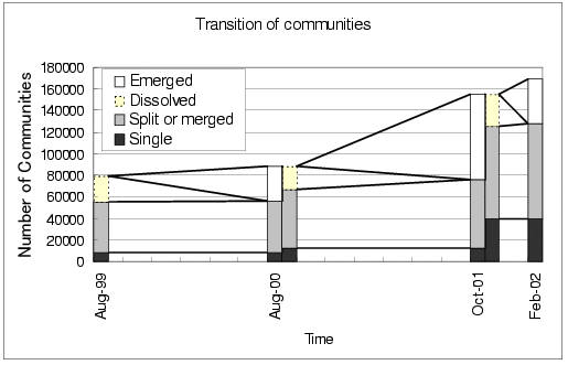 Although the size distribution of communities is stable, the structure of communities changes dynamically. Figure 1 shows how many communities are involved in each type of changes from tk-1 to tk. Each bar represents the number of communities in charts at the time. Bars at 2000 and 2001 are split vertically, since they have the previous and the next charts to be compared. Each colored block represents the number of communities involved in a particular change. Dotted blocks represent dissolved communities from tk-1, and white blocks represent emerged communities. Gray blocks represent communities that are involved in split or merge. Finally, black blocks represent single communities that are not involved in these changes, but may grow or shrink. We can see that the structure of our chart changes mainly by split and merge, in which more than half of communities are involved. The number of single communities are small (only about 10% from 1999 and 2001). About 25% of communities are dissolved from each time.