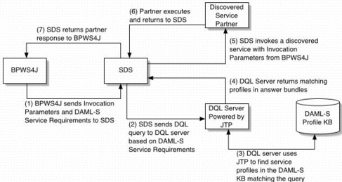 Upon receiving an invocation request, the SDS sets to work at discovering a service partner that meets the user and functional constraints encoded in the request. The DAML-S restrictions are wrapped into a DQL query and sent to the DQL server. The DQL server invokes the JTP DAML+OIL reasoner to compute the set of DAML-S profiles meeting the query criteria. Matching DAML-S profiles are returned to the SDS as answer bundles. The SDS selects a partner from the answer bundles and invokes the partner's endpoint with the message parameters supplied by BPWS4J. The partner does its work and responds to the SDS, which in turn forwards the response to BPWS4J. BPWS4J recovers flow control, and continues executing the process workflow, invoking the SDS whenever a customized Web service invocation is needed (see Figure 1).