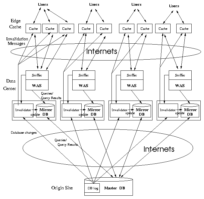 edge caches and (b) synchronization of database replicas in the