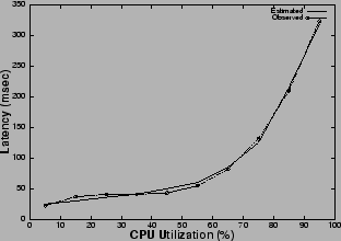 The publish/subscribe messaging service [18] under consideration supports a programmatic interface, based on the standard Java Messaging Service (JMS) API, and allows for attribute-based subscription of published messages. One key QoS parameter for a pub/sub messaging service [18] is the latency of a message, i.e., the time a message takes to reach a subscriber from a publisher via the messaging broker assuming zero network delay. The latency for a message is observed to vary with the CPU utilization of the broker in a manner, described in Figure 4. Hence, to ensure an upper bound on the latency guarantee as per the SLA, the CPU load should be kept below the threshold value. This places a limitation on the number of requests which can be serviced, as allowing any more requests would load the CPU above the threshold value and violate the latency bound resulting in losses for the publish/subscribe service provider. Thus, we can view the CPU as a resource which has a capacity equal to the threshold value which limits the number of concurrent requests. We instrumented the messaging service to obtain a performance model, and to determine the CPU thresholds to satisfy the QoS guarantees and the corresponding limit on the number of concurrent requests (Figures 4, 5), which is the capacity of the service.