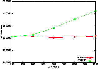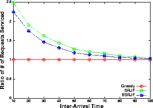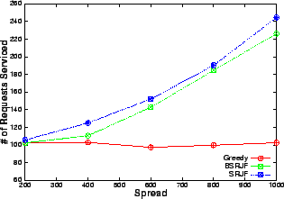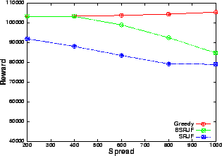 The number of requests serviced by our heuristics increases significantly with increase in spread as is evident from Figures 9 and 10. Since the mean service time and arrival rate are the same, the number of conflicts for resource should be comparable for all the data points. Hence, the only attribute, which increases, is the variability in the service time of the requests. As our algorithms take the service time as the most important criterion (SRJF uses it as the only criterion), the increase in variability allows our algorithm to make more intelligent decisions. This is reflected in the improved performance as opposed to greedy, which services approximately the same number of requests at all values of spread. A similar trend is visible (Figure 11) in the revenue obtained by balanced SRJF when compared with greedy. The increase in spread increases the revenue of the balanced SRJF whereas it clearly shows no effect on the performance of greedy, which is blind to service time variability.
