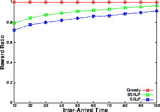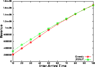 The results show (Figures 6, 8) that when the resource is in plenty (i.e., at low arrival rates or large inter-arrival delay), greedy performs as good as SRJF and BSRJF algorithm. This is expected because the requests are rejected very rarely, as at most times, spare capacity is available. However, as the request arrival-rate increases, the intelligent algorithms consistently beat the greedy heuristic by a large margin. In fact, we observe that the total number of requests serviced are more than doubled at a high request rate (low inter-arrival delay). These indicate that, as the number of admission control decisions increase, the performance improvement of our algorithm over greedy increases, emphasizing their superiority over greedy at heavy load. We note that BSRJF services approximately the same number of requests as SRJF. However, we note that the reward obtained by SRJF is less than BSRJF (Figures 6, 7). Hence, BSRJF gets a significant increase in rewards with only a small increase in penalty as compared to SRJF, thus increasing the revenue considerably.
