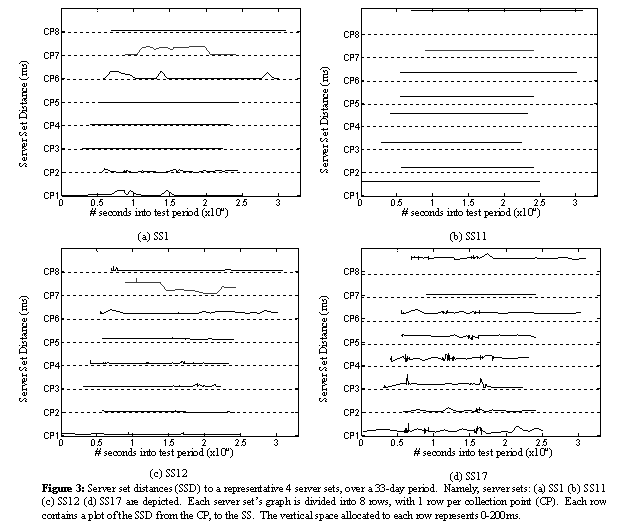 We were also interested in knowing whether the SSD of a single server set was consistent across all collection points. In Figure 3, we provide this comparison for 4 of the server sets. Each graph in Figure 3 represents a single server set, and is divided into 8 rows. Each row represents the SSD observed by one of the 8 CPs. The vertical space allocated to each row represents 0-200ms. The intent of this format is to enable visualization of the SSD for a single server set - CP pair over time, and relative comparisons across CPs. For example, in (a) the SSD from CP7 was approximately 10 ms in the initial and final samples, but hovered around 80ms in-between. In (b) the SSD from CP8 to SS11 was consistently about 190ms. These graphs illustrate that the target server sets did not provide uniform SSD values across all of the collection points.