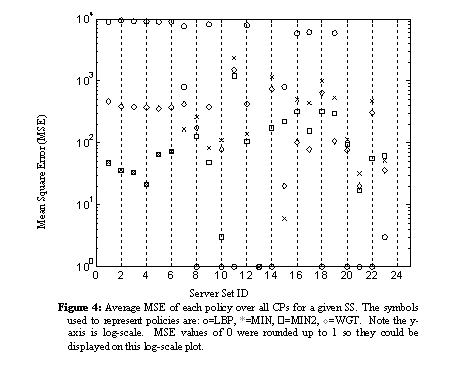 To gain insights into this issue, we plotted the minimum MSE values for each server set, on a per CP basis. This plot is provided in Figure 5. Note that each graph in Figure 5 represents only the MSE values for the policies selected for each server set. For example, (a) contains those server sets assigned the LBP policy, namely SS8, SS10, SS11, SS13, SS14, SS18, and SS20-23. Graph (b) depicts server sets assigned the MIN2 policy. Server sets assigned the remaining policies, WGT and MIN, are shown in (c).