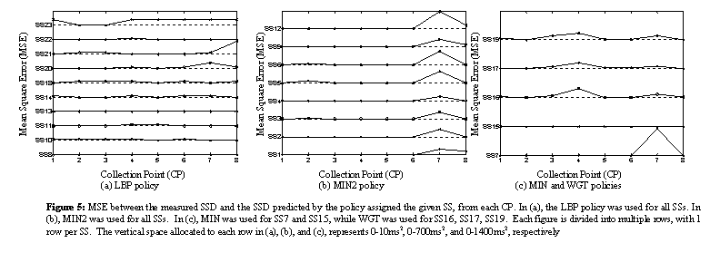For SS16, SS17 and SS19, the average MSE values for the WGT policy were lower than for the other policies. However, the average MSE values for WGT were higher than for policies selected for other server sets. We experimented by varying the weight assigned the server with the minimum RTT, versus the remaining servers in the set. We also tested variations that uniformly distributed a percentage of the traffic over the 2 servers with the minimum RTT, and uniformly distributed the remaining percentage over the other servers in the set. We were unable to find a policy that achieved a better average MSE value. Likewise, the MIN policy achieved the best results for SS7, but was higher than the minimum average MSE values for other server sets. The average difference between the observed SSD and the SSD predicted by the MIN policy for SS7 was approximately 13ms.
