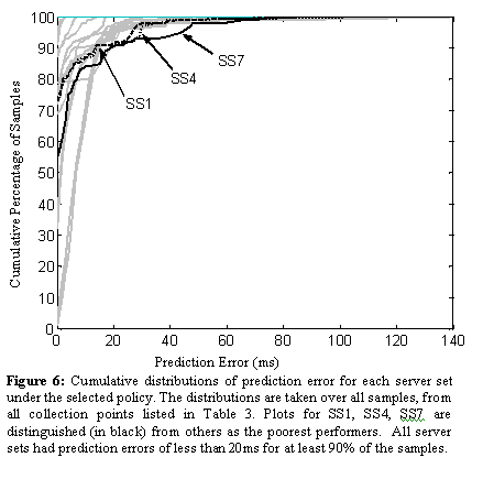 The cumulative distributions of the sample prediction errors for each server set are plotted in Figure 6. The distributions represent all samples, taken from all of the collection points listed in Table 3. All of the server sets had prediction errors of less than 20 ms for over 90% of the samples, with SS7 performing the worst. In SS7, 9% of the samples had prediction errors of 20 ms or more. Upon closer inspection, we noted that all of the samples with prediction errors of 10ms or more were localized to 5 collection points. An examination of the raw data indicated that C04 and C08 were both consistently directed to hosts in the Chicago area. C04 is located in the San Jose area; C08 is located in the Seattle area. Other collection points proximal with C04 and C08 were directed to San Jose and Seattle areas, respectively.