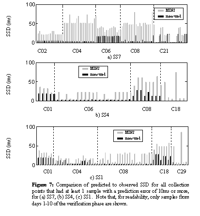 In Figure 7, we plot the individual SSDs, both observed and predicted, for those collection points that registered a prediction error of 10ms or more on at least 1 sample. That is, Figure 7 includes only the server set – collection point pairs that achieved the poorest prediction results. To be precise, only the server sets with the highest percentage (8-9%) of samples with prediction errors of 20ms or more, and only the collection points that had at least one sample with a prediction error of 10 ms or more to these server sets are represented.