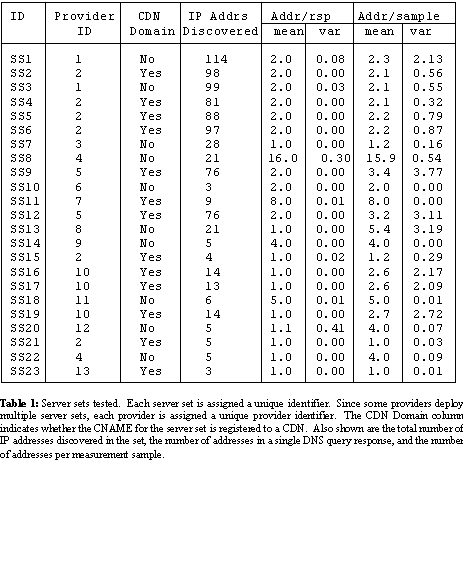 Using these techniques, we compiled a list of 23 server sets believed to be deployed by a CDN or on geographically distributed systems. This list is provided in Table 1. To anonymize this list, we assigned a numeric identifier to each server set. We used the domain part of the DNS name to distinguish between providers and we assigned a provider identifier to illustrate which server sets were deployed by the same provider. It is common for a single CDN to partition its servers into multiple server sets, and host customer content from a single server set. Our target server set list includes examples of such deployments.