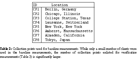 Baseline measurements were taken over a 33-day period starting in July 2002, and produced two datasets. The first, A1, will establish empirical values for aik, and the second, D1, comprises observed values for dij, where i denotes clients in Table 2 and j denotes servers specified by the ADNS of server sets in Table 1.