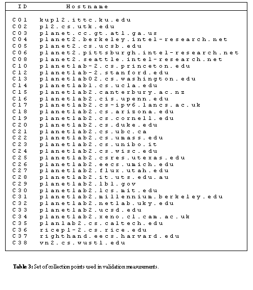 Measurements used in the validation phase of our analysis were taken over a 15-day period starting in October 2002, and produced two datasets, A2 and D2. The same target server sets and measurement techniques employed for A1 were used to capture A2, with the exception that data was collected using the PlanetLab [12] servers listed in Table 3.
