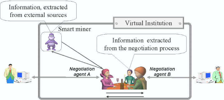 The embedded data mining system provides the information extracted from the external sources. The system complements and services the information-based architecture developed in [5] and [11]. The information request and the information delivery format is defined by the interaction ontology. As these agents operate with negotiation parameters with a discrete set of feasible values, the information request is formulated in terms of these values. As agents proceed with negotiation they have a topic of negotiation and a shared ontology that describes that topic. For example, if the topic of negotiation is buying a number of digital cameras for a University, the shared ontology will include the product model of the camera, and some characteristics, like ``product reputation'' (which on their own can be a list of parameters), that are usually derived from additional sources (for example, from different opinions in a professional community of photographers or digital artists). As the information-based architecture assumes that negotiation parameters are discrete, the information request can be formulated as a subset of the range of values for a negotiation parameter. For example, if the negotiator is interested in cameras with 8 megapixel resolution, and the brand is a negotiation parameter, the information request can be formulated as a set of camera models, e.g. {``Canon Power Shot Pro 1'', ``Sony f828'', ``Nikon Coolpix 8400'', ``Olympus C-8080''} and a preference estimate based on the information in the different articles available. The collection of parameter sets of the negotiation topic constitutes the input to the data mining system. Continuous numerical values are replaced by finite number of ranges of interest.