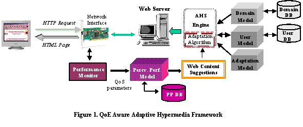 Currently the adaptive hypermedia research places very little emphasis on end-user QoE. This QoE-unaware approach is perhaps unsuited to a general Web browsing environment made possible by advances in technology. For instance, one can imagine a person with a laptop moving from a low bandwidth home connection, to a higher bandwidth office connection, and potentially to a public transport with a mobile connection with a widely varying bandwidth. It is unrealistic to expect that the quality of delivery of the same content can be maintained in this variable environment, but rather an effort must be made to fit the content served to the current delivery conditions. It should be noted that some AHS have taken into consideration some performance features (e.g. device capabilities, the type of the access, state of the network, etc.) in order to improve the end-user QoE. For example GUIDE [2] system considers hand-held units as tools for navigation and display of an adaptive tourist guide INTRIGUE [3], a tourist information system that assists the user in the organization of a tour, provides personalised information that can be displayed on WAP phones. Merida has considered HTTP protocol, type of the access and the server load in the design of the SHAAD [4]. However, these account for only a limited range of factors affecting QoE.