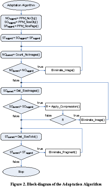 A block-diagram of the algorithm is presented in Figure 2. The algorithm uses as parameters the PPM suggestions: maximum number of embedded objects (NOsuggest), maximum total size of objects (SOsuggest) and maximum size of a Web page (SPsuggest). In the algorithm, the check for the number of embedded objects is performed before the verification of the total size of the embedded components. Therefore image elimination may occur before image compression. This was preferred due to the fact that setting up multiple connections to carry a higher number of objects is time consuming and reduces the overall performance of the delivery.