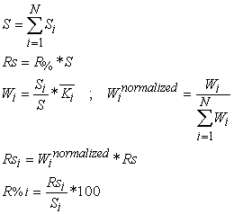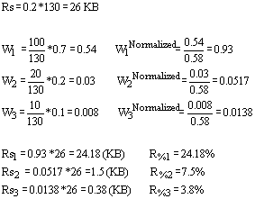 The first step involves trying to apply image compression. Different compression rates (expressed as percentage) are applied to each image depending on: the total reduction suggested on the total size of embedded images, the image size and the user interest in the image. For example, if two images A and B need to be reduced by a total of 40% with the user being more interested in image A than image B, then a smaller reduction will be applied to image A than the one performed on image B. The actual compression rates will be computed according to their relative interest. The algorithm for determination of the compression factors for each image (R%i) takes into consideration user interest on them and uses the following formulas (Eq. 1):