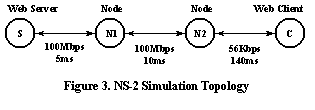 The simulations were performed using Network Simulator version 2 (NS-2) [24] and a NSWEB [25] extension for simulating WWW traffic. The simulation set-up topology consists of a simple Web Server - Web Client system. Figure 3 represents a residential client 56 kbps modem connection and round-trip-time (RTT) of 310 msec. In the absence of other background traffic, the bottleneck link is the client network connection. Several different connections and network properties were considered that correspond to low bit rate operational environment as perceived by people through a home Internet connection. Therefore the bandwidth between Web Client and node N2 was set-up with different values between 28 kbps and 128 kbps while the RTT between the Web server and the Web client was considered to be between 530 msec and 150 msec respectively.