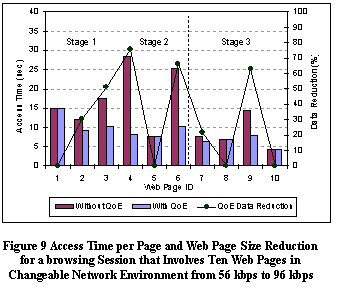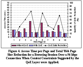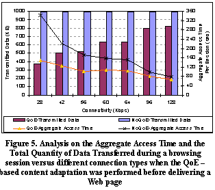 Performance analysis is based on comparative measurements of two cases: with and without QoE based content adaptation. For both cases, Access Time (DownloadTime) per page, Aggregate Access Time per session, Quantity of Data Transmitted, andPercentage of the Data Reduction are measured. The Aggregate Access Time per session is measured as the sum of the access times per page.