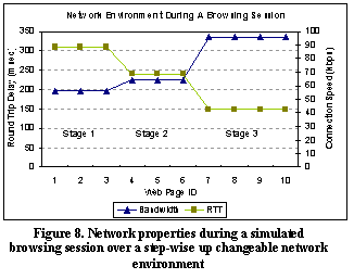 kbps bandwidth and 150 msec RTT to 56 kbps and 340 msec RTT via