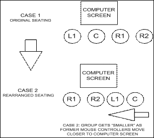 To observe the possibility of variation in overall interactivity by shuffling seating, we experimented in two cases where we took the mouse-controlling children and moved them to the sides, and placed in the control position a child from one of the sides. In both cases, the child formerly in the control position was the highest classroom performer from among the three, and the replacement child was identified as a poorer classroom performer.