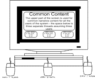 The case for multiple user content could at the simplest level only extend a few more exercises to make sure that all the users are getting turns to interact, and at a more complex level could run separate threads to deal with each user as a separate learner. Thus, in the example showed in figure 9 below, for instance, the narrative content may remain the same, but different multiple choice questions may keep appearing for all the users based on their individual needs, and all the users can also have different numbers of questions thrown at them, to make sure that faster learners can be kept occupied while the slower learners catch up.