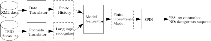 Hence the basic idea is that translated the specification of the system given in TRIO into Promela, the input language of SPIN, the framework states if the data already present satisfy the specification; if not the model checker shows where the specification is violated.