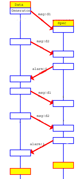 Now if we consider the data shown in Figure 1 and we add two channels, one for the stock information and one for the exchange information, to connect them to the acceptor automaton, that represent TRIO properties, we can verify if the data stream is conform to the specification. In this example we obtain the counterexample shown in a visual representation in Figure 2. The first process (the one on the left) represents the history manager and the second one (on the right) the specification. Each time instant the history manager sends to the specification data and through the channel message. After evaluating the data, the specification sends to the history manager the a true alarm value signaling anomalies with respect to the received data. In this example at the second time instant the sent data violates the specification.