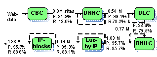 For city detection we developed two kinds of methods dealing with 1) site content and 2) site-level data (domain name and IP address). The methods were combined in a workflow shown in Figure 1. The number of classified sites, precision (P) and recall (R) values calculated by EMC are provided for each classification step. Dashed arrows reflect the fact that classification results are combined with input data for subsequent processing, so classification results are accumulated along the workflow.