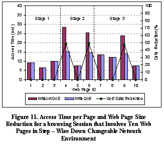 Performance analysis is based on comparative measurements of two cases: with and without QoE based content adaptation. For both cases, Access Time (DownloadTime) per page, Aggregate Access Time per session, Quantity of Data Transmitted, andPercentage of the Data Reduction are measured. The Aggregate Access Time per session is measured as the sum of the access times per page.