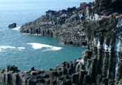If you follow the farm road 600 m to the southwest from Depo-dong, at the end of the pine tree forest is a cliff. At the base of this cliff is the Jisatgae Coast along with the imposing stone pillars. The Jusangjeolli are stone pillars piled up along the coast and is a designated cultural monument of Jejudo Island. The Jusangjeolli was formed when the lava from Mt.Hallasan erupted into the sea of Jungmun. They are rock pillars shaped like cubes or hexagons of various sizes and almost seem as if stonemasons had carved them out. The administration of the district named them ‘Jisatgae Rocks’ from their old name ‘Jisatgae’. Its 20 m cliff makes it a popular spot for high tide, sea angling. The waves of the high tides crashing into the side of the cliff provide a breathtaking view of the ocean surrounding the pillars. |