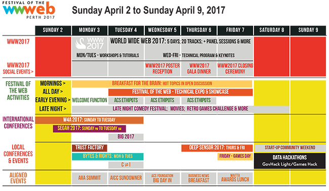 WWW2017 runs across five days and will include a three-day technical program, two days of workshops and tutorials, and a poster and demos display - plus broad alternate tracks, keynote speeches and invited talks, seminars and panel discussions.